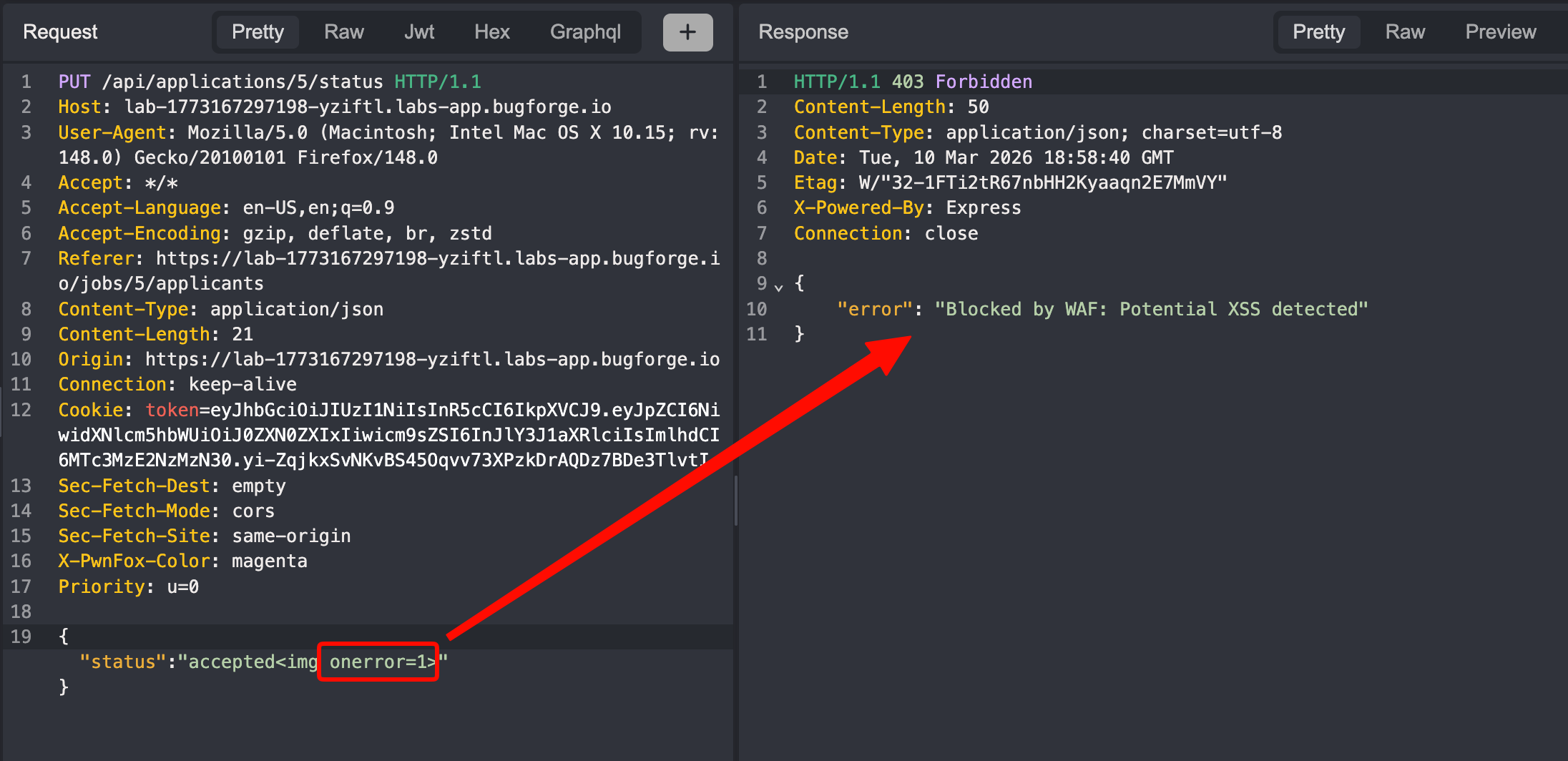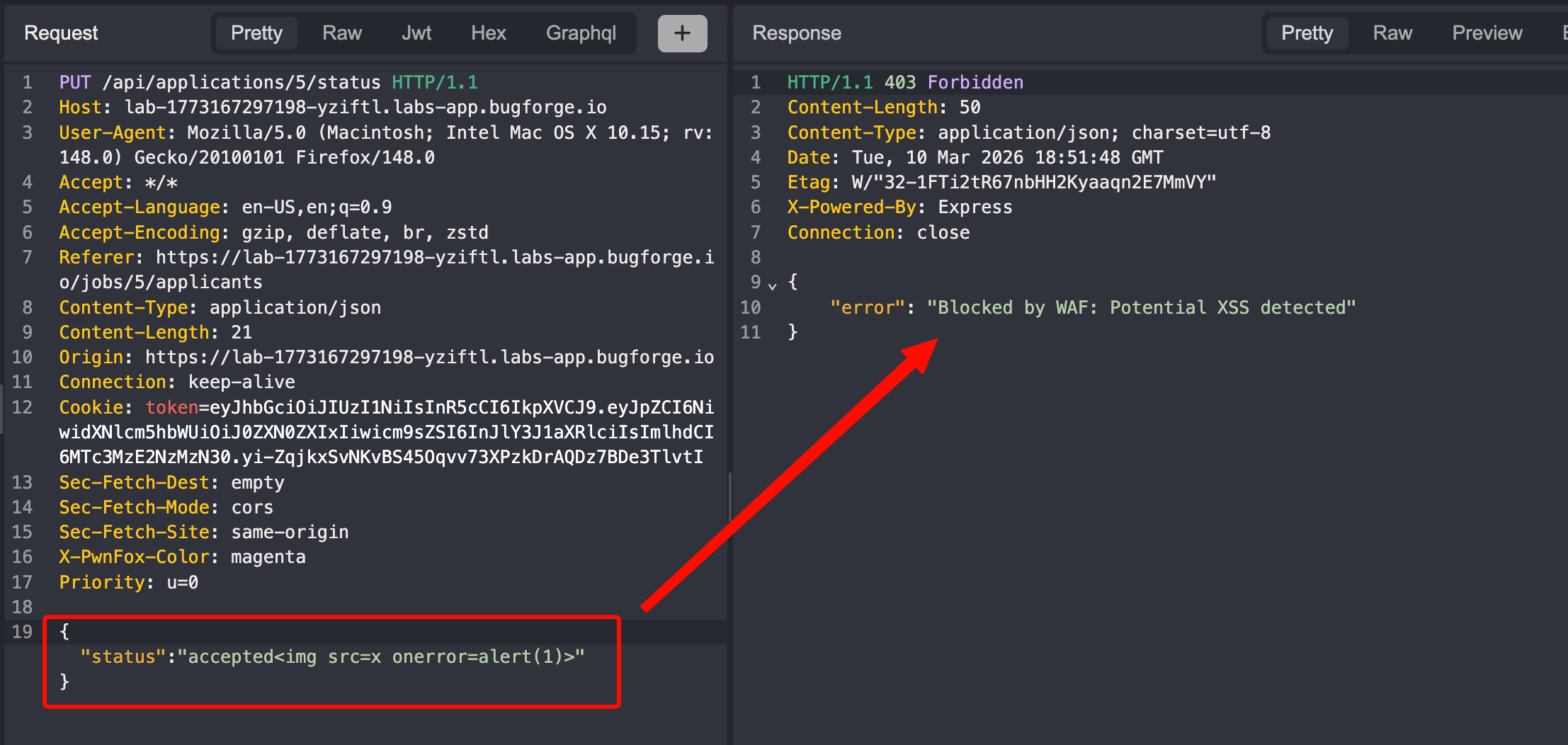 /api/applications/:id/statusendpoint. For example, anything that is not the string “accepted” or “rejected” should be…rejected. In the current instance, the developers appear to be using a deny list to block certain words to prevent XSS attacks. Deny lists are generally less secure than allow lists, since it’s difficult to include all possible abuse cases in the deny list and they can usually be circumvented. - Send a CSRF token with every state-changing HTTP request and ensure that it is validated on the server-side.