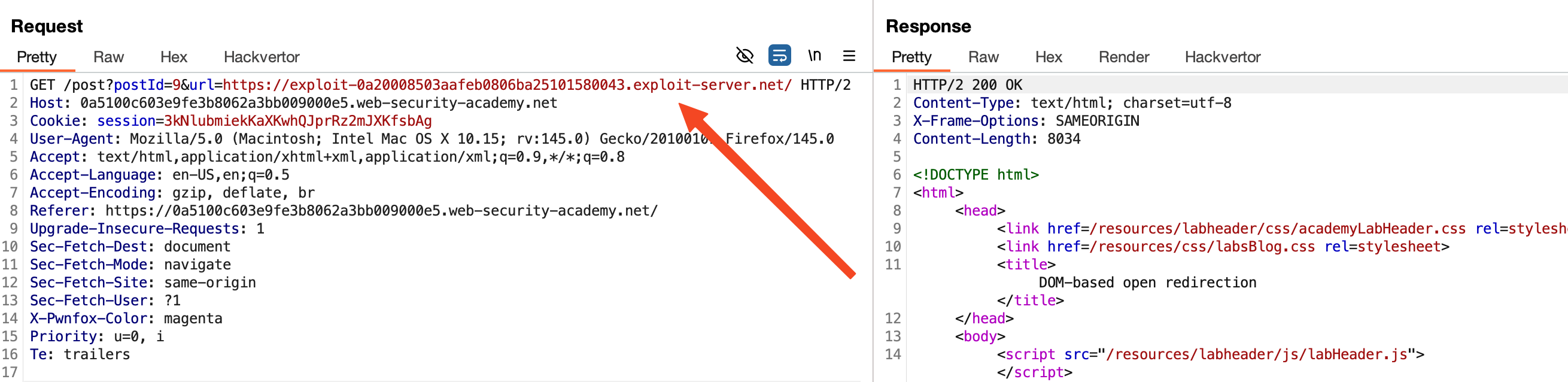 This lab contains a DOM-based open-redirection vulnerability. To solve this lab, exploit this vulnerability and redirect the victim to the exploit server.
