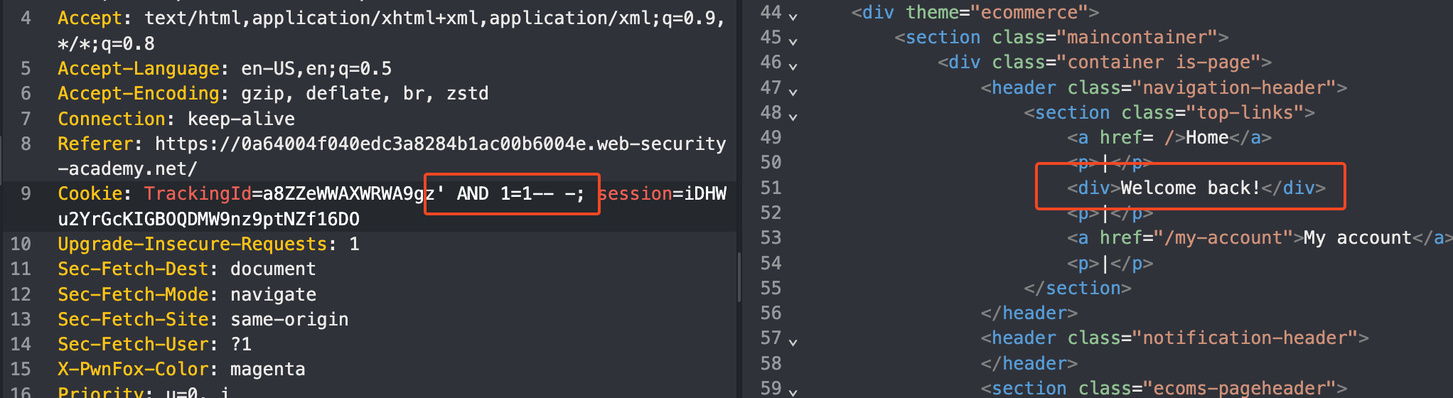 Note that if we inject an always true condition in the tracking cookie, we get the "Welcome back" message.