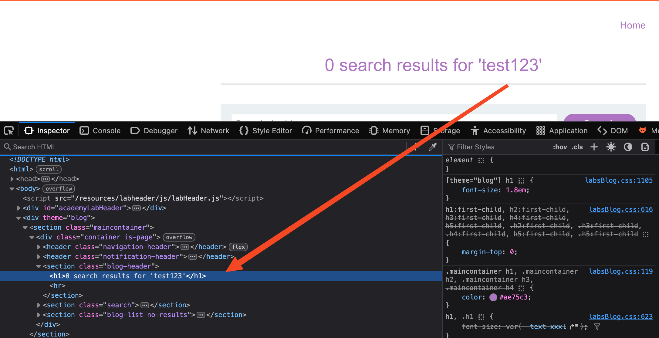 Whatever we enter into the search box is reflected in an <h1> tag with nothing escaped.