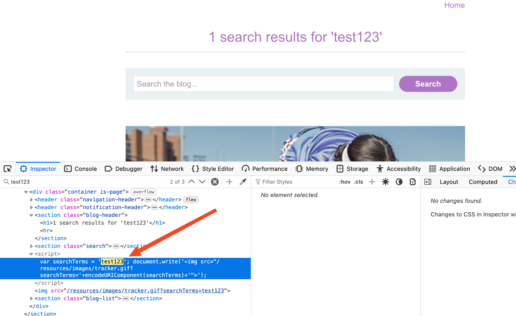Note that when we enter a term in the search bar, that term is reflected inside of a <script> tag.