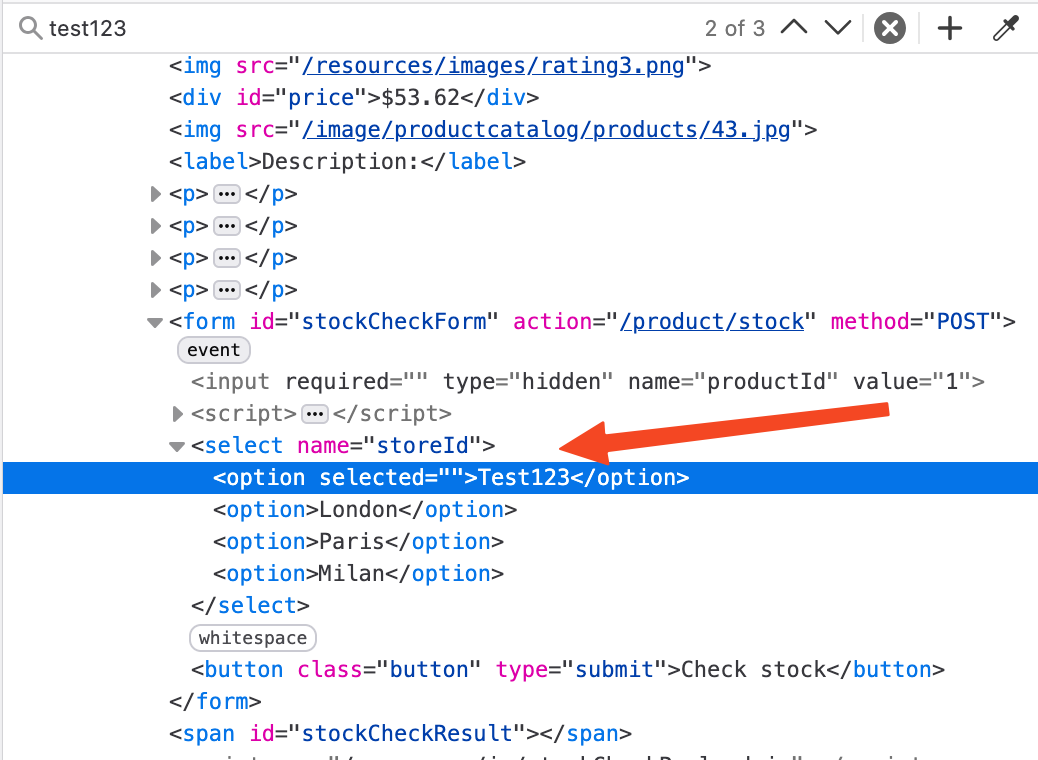 Notice that this application has functionality to check the stock of certain items at particular locations. Sending the following request adds a new selection option: