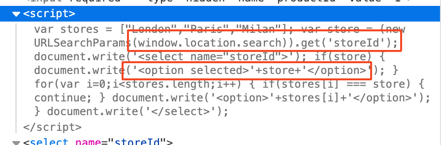 This is taking input from the storeId parameter, and is writing it to the page inside of an option tag using the document.write function.