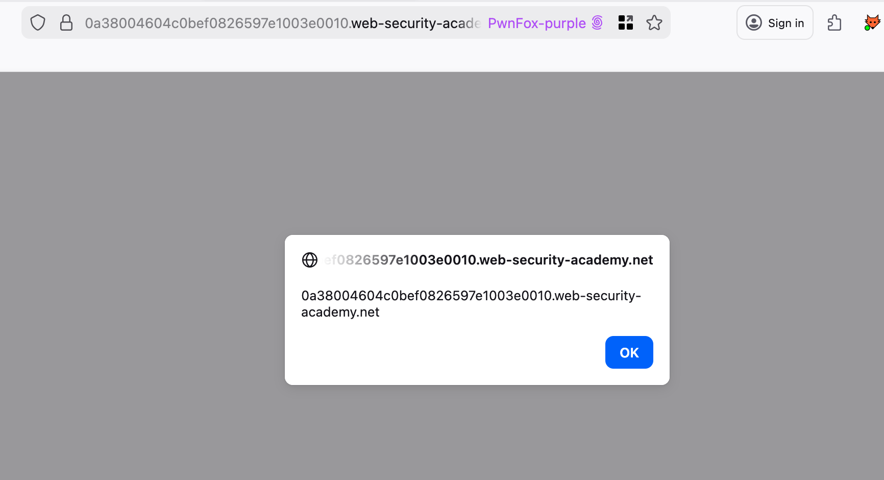 https://0a38004604c0bef0826597e1003e0010.web-security-academy.net/product?productId=1&storeId=Test123%3C/option%3E%3C/select%3E%3Cscript%3Ealert(document.domain)%3C/script%3E