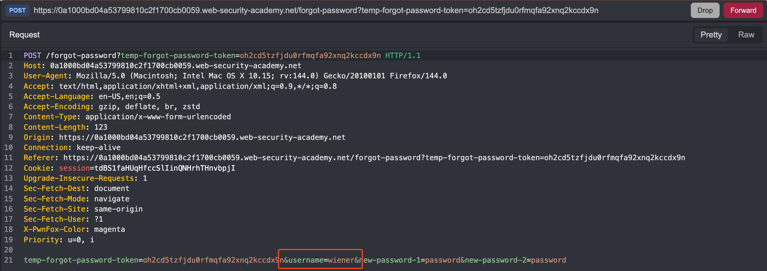 Set your proxy to intercept requests and click on the reset link. Keep the intercept proxy on and enter a new password. Note that the username parameter is included in the request.