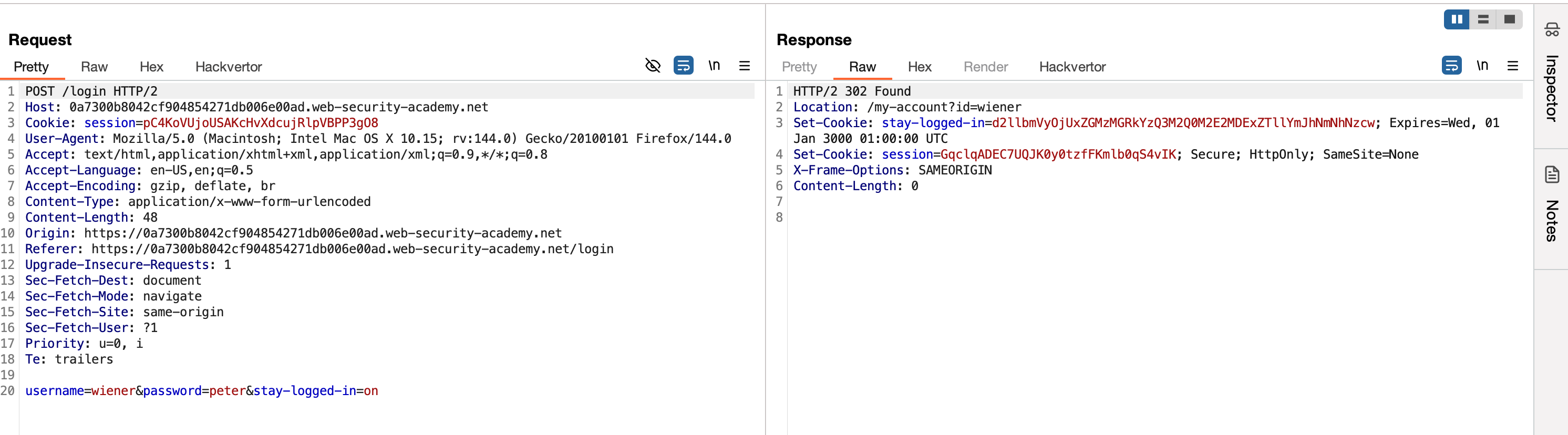 This lab allows users to stay logged in even after they close their browser session. The cookie used to provide this functionality is vulnerable to brute-forcing.