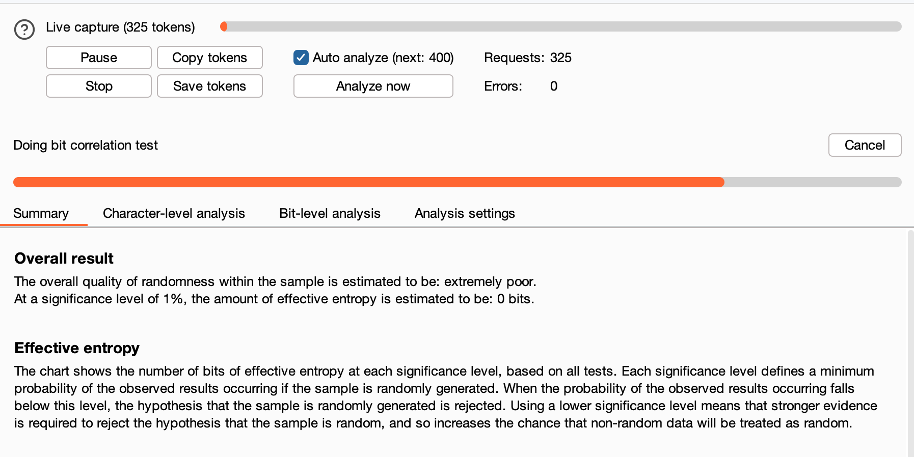 Send the login request to sequencer and analyze both cookies. The stay-logged-in cookie entropy is extremely poor.