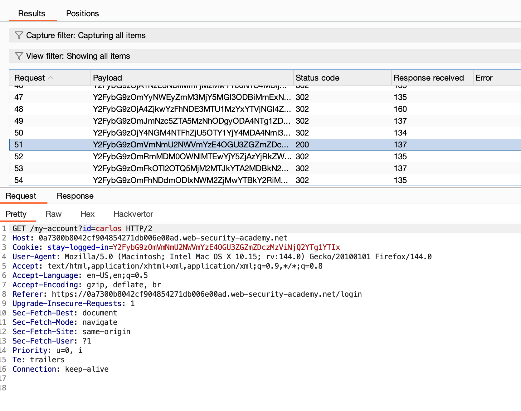 To solve the lab, brute-force Carlos's cookie to gain access to his My account page.